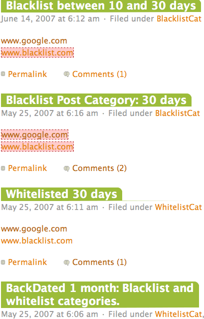 - However if the post is in the “WhitelistCat”, www.blacklist.com will always follow in the post. In comments, www.blacklist.com will no follow if more than 10 days old. (Use this for link exchanges so you never accidentally go back on your word at a later date.)